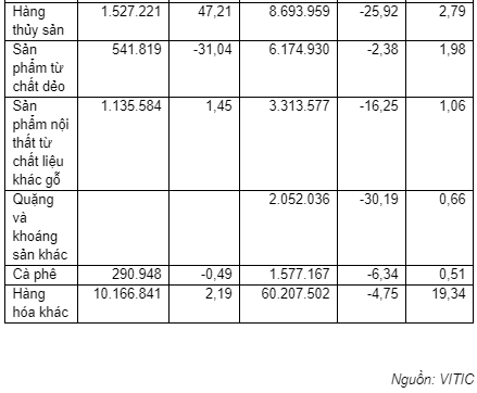Nhóm hàng máy vi tính, sản phẩm điện tử và linh kiện đứng thứ 2 về kim ngạch, đạt 35,89 triệu USD, chiếm 11,9%, giảm 4,2%; tiếp đến máy móc, thiết bị, dụng cụ, phụ tùng đạt 23,07 triệu USD, chiếm 7,4%, tăng 1,4%; Giày dép các loại đạt 22,05 triệu USD, chiếm 7,1%, giảm 8%; hàng dệt, may đạt 16,35 triệu USD, chiếm 5,3%, giảm 15,9%.