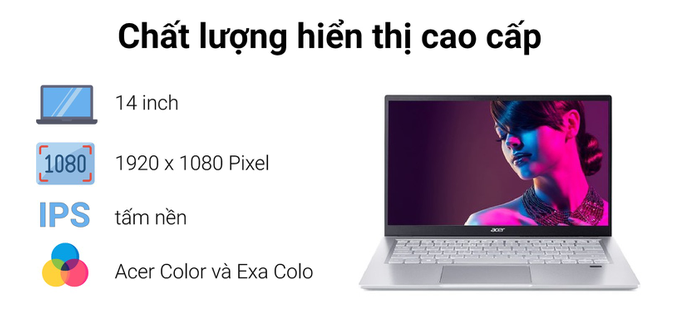 Viền màn hình siêu mỏng luôn mang đến nhiều không gian hình ảnh hơn. Trước mắt bạn là màn hình 14 inch tiêu chuẩn, độ phân giải Full HD sắc nét, tấm nền IPS chất lượng cao của Acer Swift. Tỉ lệ màn hình so với thân máy đạt tới 82,73%, góc nhìn rộng, cho trải nghiệm hình ảnh thực sự đắm chìm. Công nghệ màu sắc Acer Color thông minh và Exa Color sống động, chân thực giúp mọi thứ đều trở nên hấp dẫn hơn.
