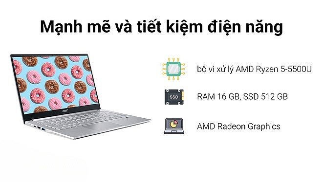 Phiên bản Acer Swift 3 SF314-43-R4X3 sử dụng bộ vi xử lý AMD Ryzen 5 5500U thuộc thế hệ 5000 series mới nhất. Con chip này không chỉ cực mạnh với 6 nhân 12 luồng, tốc độ tối đa lên tới 4.0GHz mà còn được sản xuất trên tiến trình 7nm hiện đại, sử dụng hiệu quả và tiết kiệm năng lượng.