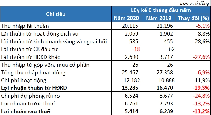 Tổng thu nhập hoạt động của Agribank trong 6 tháng đầu năm đạt 25.467 tỉ đồng, giảm 6,9% so với cùng kì 2019. Cùng với chi phí hoạt động của ngân hàng tăng 11,9% lên mức 12.182 tỉ đồng, lãi thuần từ hoạt động kinh doanh giảm 19,3% về 13.285 tỉ đồng. Trong kì, Agribank giảm 24,8% chi phí dự phòng rủi ro so với cùng kì năm trước xuống 6.524 tỉ đồng nên lợi nhuận trước thuế chỉ giảm hơn 13%.