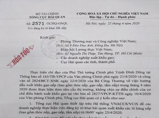 Ngày 22/4, Tổng cục Hải quan đã có văn bản số 2571/TCHQ-GSQL hỏa tốc gửi Phòng Thương mại và Công nghiệp Việt Nam; Hiệp hội Lương thực Việt Nam; các doanh nghiệp xuất khẩu gạo; Cục Hải quan các tỉnh, thành phố hướng dẫn thủ tục đăng ký tờ khai xuất khẩu gạo nếp.