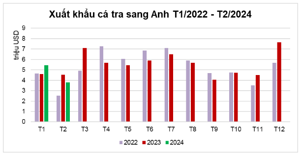 Trước đó, tháng đầu năm nay quốc gia này mua từ Việt Nam hơn 5 triệu USD cá tra, tăng 19% so với tháng 1/2023 và tăng 17% so với tháng 1/2022. Tháng 2/2024, xuất khẩu cá tra Việt Nam sang Anh giảm 16%, đạt gần 4 triệu USD, có thể do tháng này trùng kì nghỉ Tết. Tuy nhiên, con số này vẫn cao gấp rưỡi so với tháng cùng kỳ năm 2022 - năm xuất khẩu cá tra đạt kỷ lục.