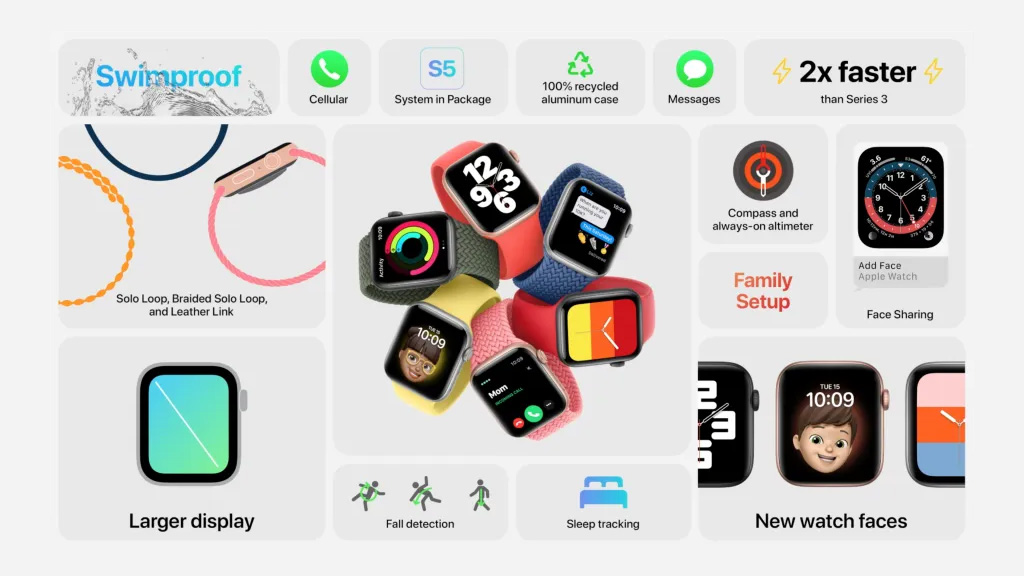 Mặc dù vậy, sản phẩm này vẫn được Apple giữ lại những tính năng đặc trưng bao gồm: theo dõi nhịp tim, theo dõi giấc ngủ, phát hiện ngã, la bàn... Apple khẳng định, bộ xử lí S5 trên Watch SE có thể mang lại hiệu suất cực kì cao, nhanh gấp hai lần so với Apple Watch Series 3.