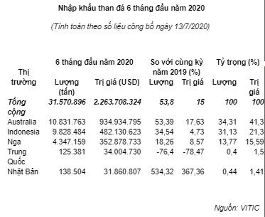 Theo thống kê của Tổng cục Hải quan, nhập khẩu than về Việt Nam trong 6 tháng đầu năm 2020 đạt trên 31,57 triệu tấn, trị giá trên 2,26 tỷ USD, giá trung bình 71,7 USD/tấn, tăng mạnh 53,8% về lượng và tăng 15% kim ngạch nhưng giảm 25,2% về giá so với 6 tháng đầu năm 2019.