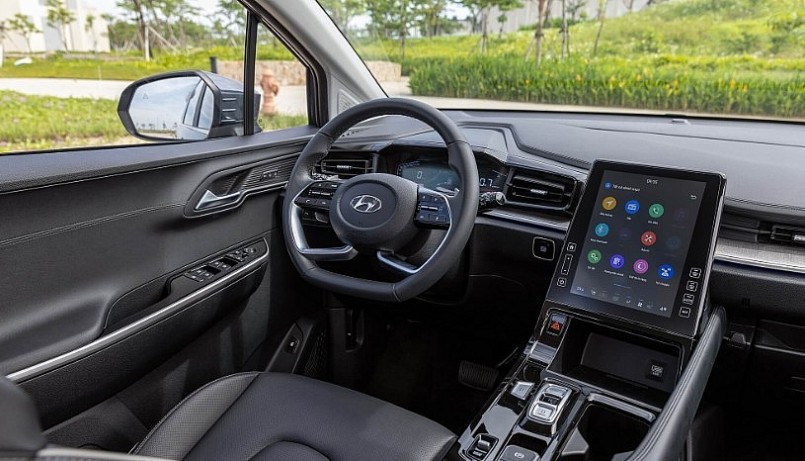Phía sau là bảng đồng hồ kỹ thuật số LCD. Hyundai Custin còn sở hữu không gian để đồ linh hoạt với dung tích đạt 261L khi dùng 3 hàng ghế, 707L khi gập hàng ghế thứ 3 và 1.223L khi gập 2 hàng ghế sau. Hơn thế, xe còn sở hữu loạt trang bị đáng chú ý khác trên xe có thể kể đến như: chìa khóa thông minh, khởi động nút bấm kết hợp khởi động từ xa, phanh tay điện tử, camera toàn cảnh 360, cửa sổ trời kép, cốp mở điện, rèm chắn nắng cho hàng ghế sau, điều hòa tự động, cửa gió điều hòa và cổng sạc cho 3 hàng ghế,...