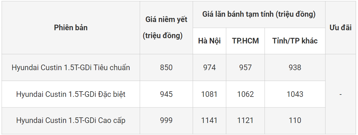 Bảng giá xe Hyundai Custin tháng 2/2024