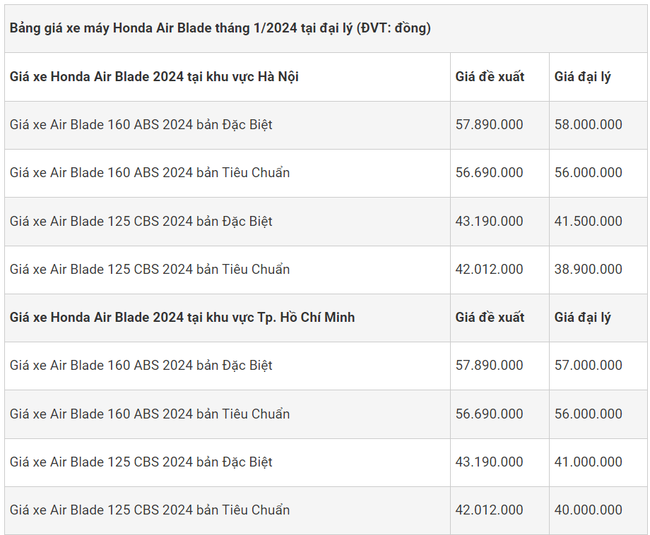 Bảng giá xe máy Honda Air Blade 2024 tháng 1