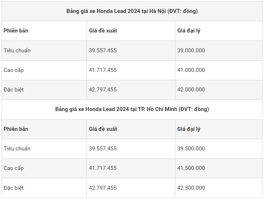 Về giá bán trong tháng 1 này, tương tự các dòng xe tay ga khác của Honda, Honda Lead đang được các đại lý giảm giá mạnh nhằm thu hút khách hàng dịp cuối năm. Đưa giá bán thực tế các phiên bản thấp hơn giá đề xuất hãng công bố. Tại Việt Nam, Honda Lead đang được phân phối với 3 phiên bản Tiêu chuẩn, Cao cấp và Đặc biệt. Xe hiện có mức giá đề xuất bán lẻ dao động từ 39,557 - 42,797 triệu đồng.