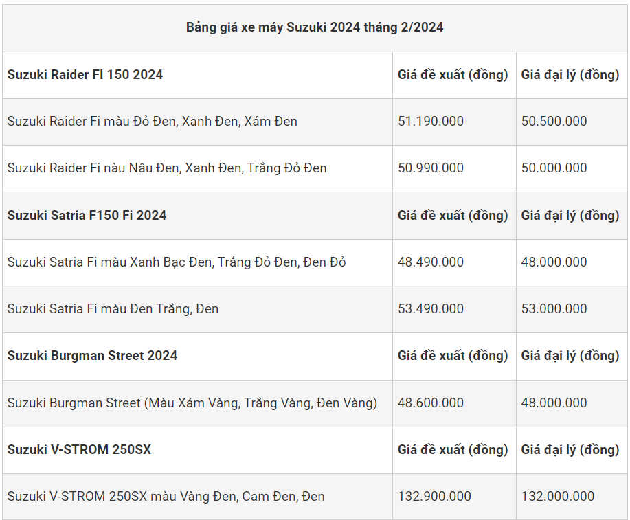 Bảng giá xe máy Suzuki đầu tháng 2/2024