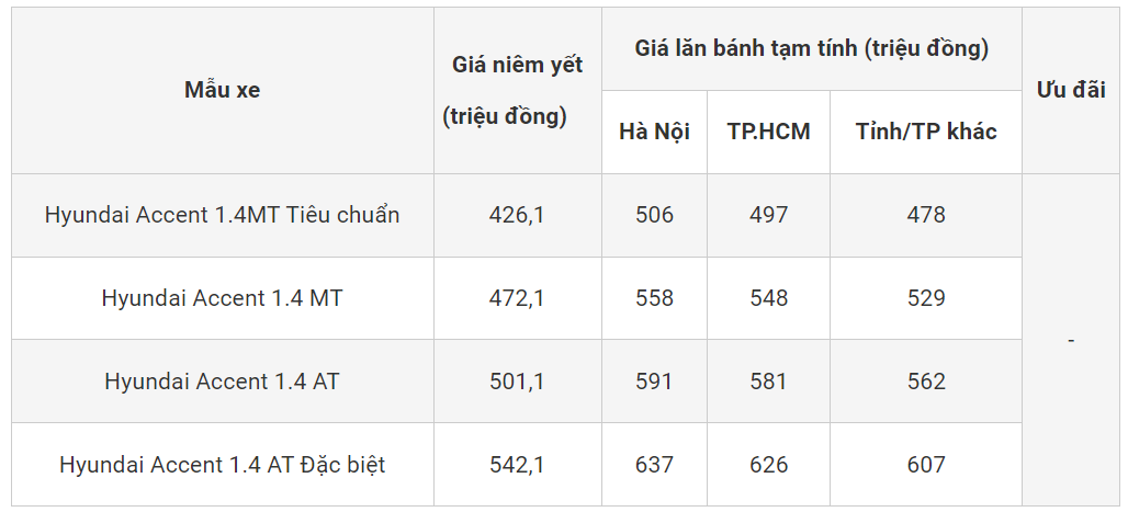 Bảng giá xe ô tô Hyundai Accent giữa tháng 2/2024