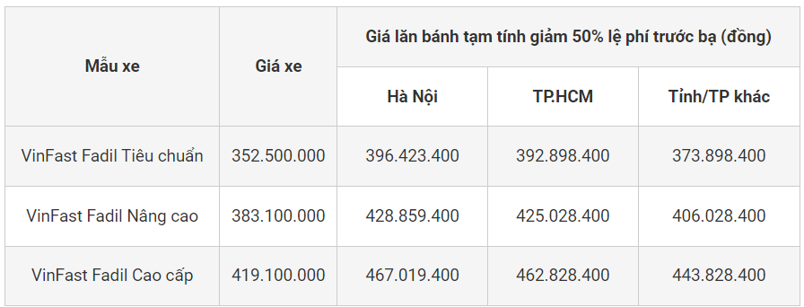 Bảng giá lăn bánh tạm tính của xe VinFast Fadil