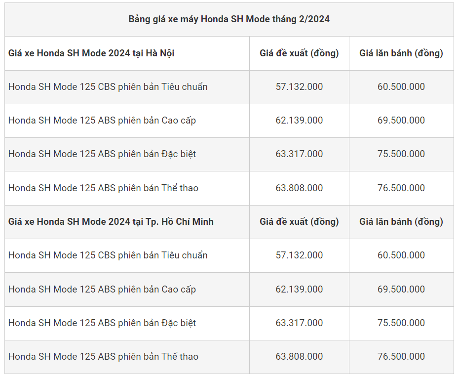 Bảng giá xe tay ga Honda SH Mode 2024 tháng 2