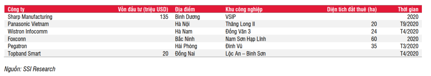 "Khi đại dịch lắng xuống trong năm 2020, các khu công nghiệp của Việt Nam sẽ đón nhu cầu lớn từ những công ty đã chuẩn bị chuyển cơ sở sản xuất sang. Do đó, nhu cầu về đất khu công nghiệp trong năm 2021 tiếp tục có nhiều triển vọng", SSI dự báo.