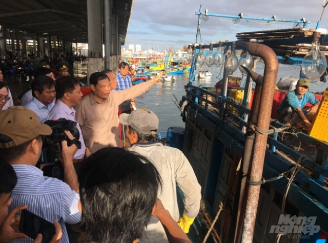 Bộ trưởng Bộ NN-PTNT Nguyễn Xuân Cường (người chỉ tay) kiểm tra công tác chống khai thác IUU tại Cảng cá Quy Nhơn (Bình Định). Ảnh: Vũ Đình Thung.