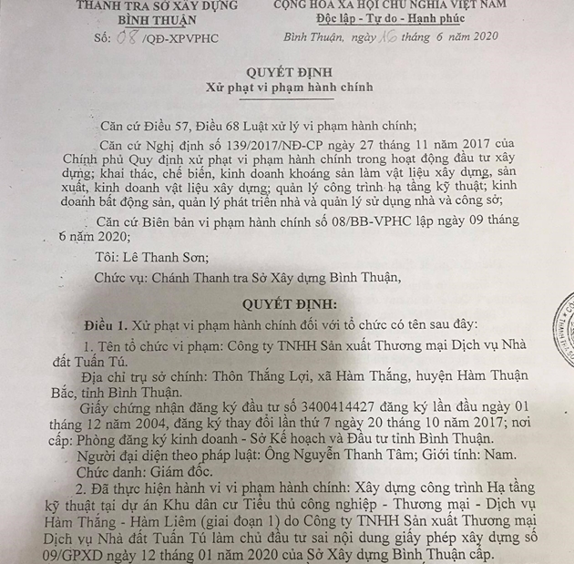 TH&SP Thanh tra Sở Xây dựng tỉnh Bình Thuận vừa ban hành quyết định xử phạt vi phạm hành chính đối với Công ty TNHH Sản xuất - Thương mại - Dịch vụ nhà đất Tuấn Tú (Công ty Tuấn Tú) do ông Nguyễn Thanh Tâm làm Giám đốc vì có hành vi vi phạm về xây dựng công trình hạ tầng kỹ thuật tại Dự án Khu dân cư Tiểu thủ công nghiệp – Thương mại – Dịch vụ Hàm Thắng – Hàm Liêm giai đoạn 1 (DA Hàm Thắng - Hàm Liêm) sai nội dung giấy phép xây dựng được cấp ngày 12/1/2020.
