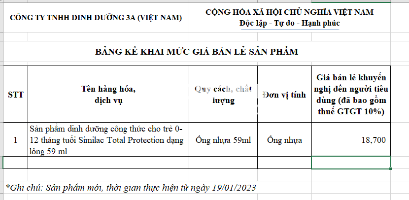 Công ty TNHH Dinh dưỡng 3A Việt Nam cũng thông báo giá bán lẻ sản phẩm mới. Thời gian thực hiện từ ngày 19/1/2023. Cụ thể: