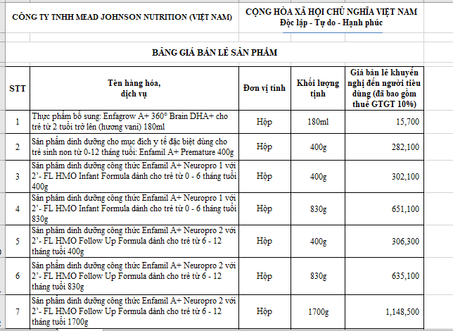 Công ty TNHH MeadJohnson tăng giá bán sản phẩm một số sản phẩm sữa, tăng giá trong phạm vi 5% so với giá kê khai liền kề trước đó. Thời gian thực hiện từ ngày 01/02/2023. Cụ thể:
