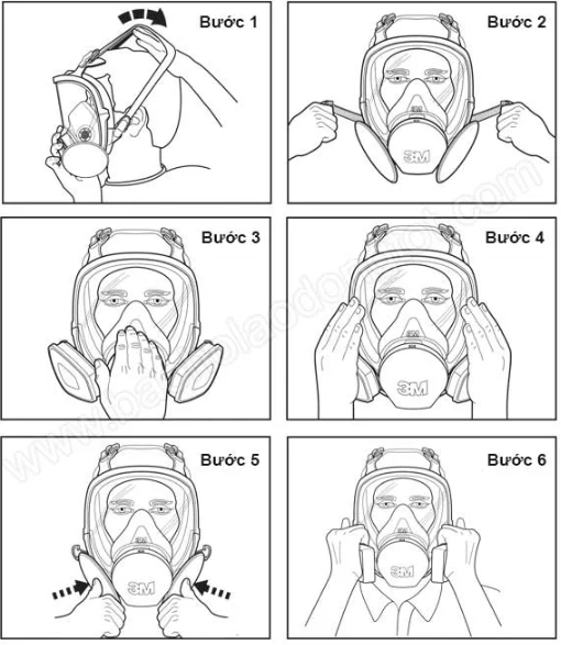 Bước 4: Kiểm tra áp suất van hít đối với phin lọc 1 bằng cách đặt lòng bàn 2 tay đặt lên phần phin lọc van hít vào nhẹ nhàng nếu bạn cảm thấy mặt kính hơi xẹp xuống thì vị trí an toàn. Nếu phát hiện thấy rò rỉ khí ở mặt, hãy đặt lại mặt nạ trên mặt của bạn và điều chỉnh lại độ căng của dây đai (Bước 2) để loại bỏ rò rỉ và kiểm tra lại.