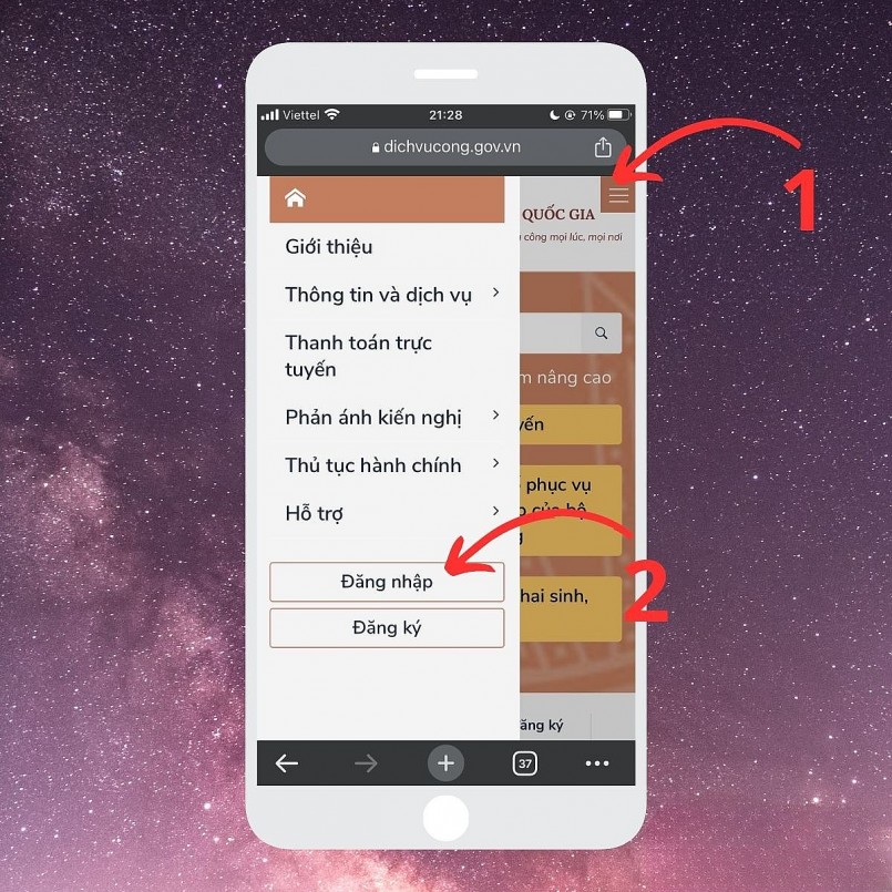 Bước 1: Bạn tiến hành truy cập vào website Cổng Dịch vụ công Quốc gia tại đây. Sau đó, bạn ấn vào biểu tượng ba gạch như hình và ấn chọn vào mục Đăng ký nếu chưa có tài khoản. Nếu đã có thì bạn ấn chọn vào Đăng nhập nhé.
