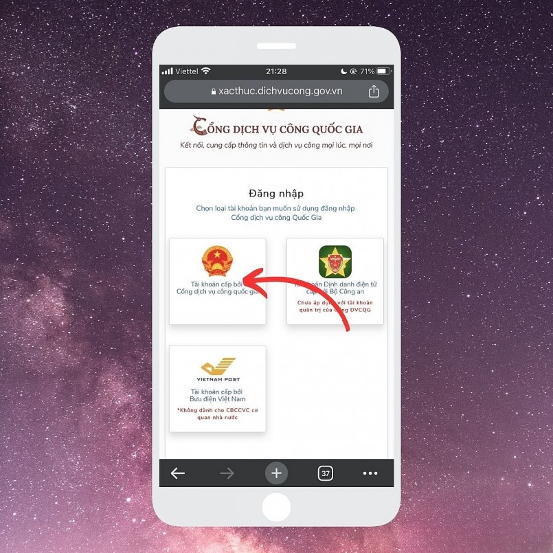 Bước 2: Bạn chọn hình thức đăng nhập mà mình muốn (ví dụ như hình là thông qua Tài khoản cấp bởi Cổng dịch vụ công Quốc gia).