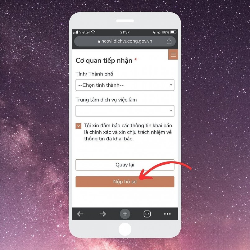 Bước 9: Bạn tiến hành điền đầy đủ thông tin theo yêu cầu. Sau đó ấn chọn vào mục Tôi xin đảm bảo các thông tin khai báo là chính xác và xin chịu trách nhiệm về thông tin đã khai báo. Cuối cùng ấn Nộp hồ sơ là hoàn tất.