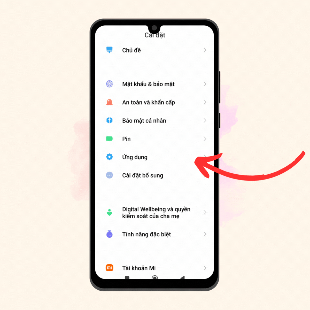 Có những ứng dụng bạn sử dụng thường xuyên và không nỡ xóa đi như Facebook thì phải làm cách nào? Tất nhiên là bạn không cần phải xóa, mà ta sẽ xóa bộ nhớ đệm của các ứng dụng này bằng cách vào Cài đặt > Chọn Ứng dụng > Bấm chọn ứng dụng cần dọn dẹp.