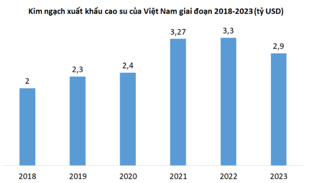 Cục Xuất nhập khẩu (Bộ Công Thương) dẫn số liệu thống kê của Tổng cục Hải quan ước tính, năm 2023, xuất khẩu cao su của Việt Nam đạt khoảng 2,14 triệu tấn, trị giá 2,89 tỷ USD, giảm 0,04% về lượng và giảm 12,7% về trị giá so với năm 2022. Giá xuất khẩu bình quân đạt 1.350 USD/tấn, giảm 12,7% so với năm 2022.