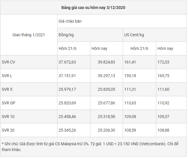 Ghi nhận vào phiên chiều ngày 3/12 (theo giờ Việt Nam), giá cao su thế giới giữ đà tăng khi có số liệu cho thấy các nền kinh tế lớn nhất Châu Á đang phục hồi từ đại dịch.