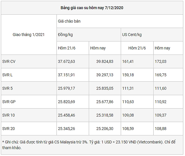 | Cập nhật giá cao su chiều nay 5/12: Dịch COVID-19 quay trở lại gây áp lực lên giá Cập nhật giá cao su chiều nay 4/12: Giảm sâu Cập nhật giá cao su chiều nay 3/12: Giữ đà tăng mạnh |