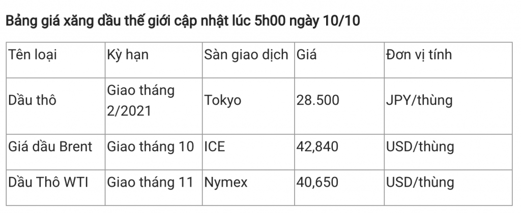 Ghi nhận vào lúc 5h (giờ Việt Nam) ngày 10/10, giá dầu thô ngọt nhẹ WTI của Mỹ ước tính đã giảm gần 1% xuống 40,65 USD/thùng, giá dầu thô Brent ước tính giảm hơn 1% xuống 42,84 USD/thùng