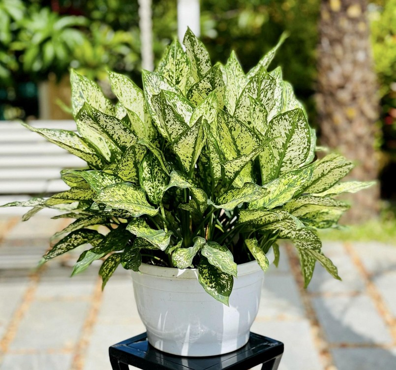 Bề ngoài, cây có thân, gân lá và sống lá màu trắng, tán lá xòe rộng với những chiếc lá khá to và bóng. Đặc biệt, lá của cây phát triển rất chậm, tuy nhiên cũng rất lâu tàn.
