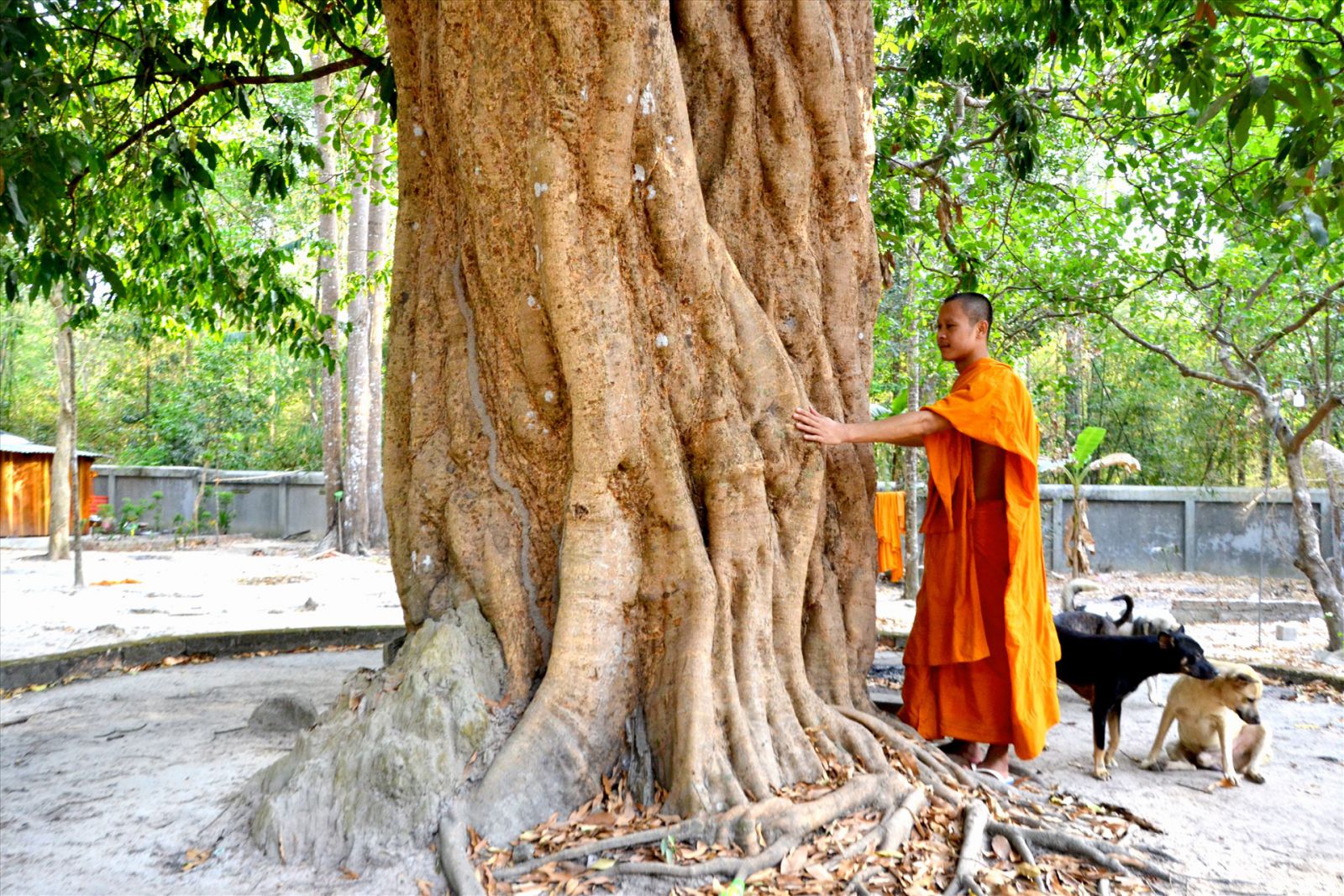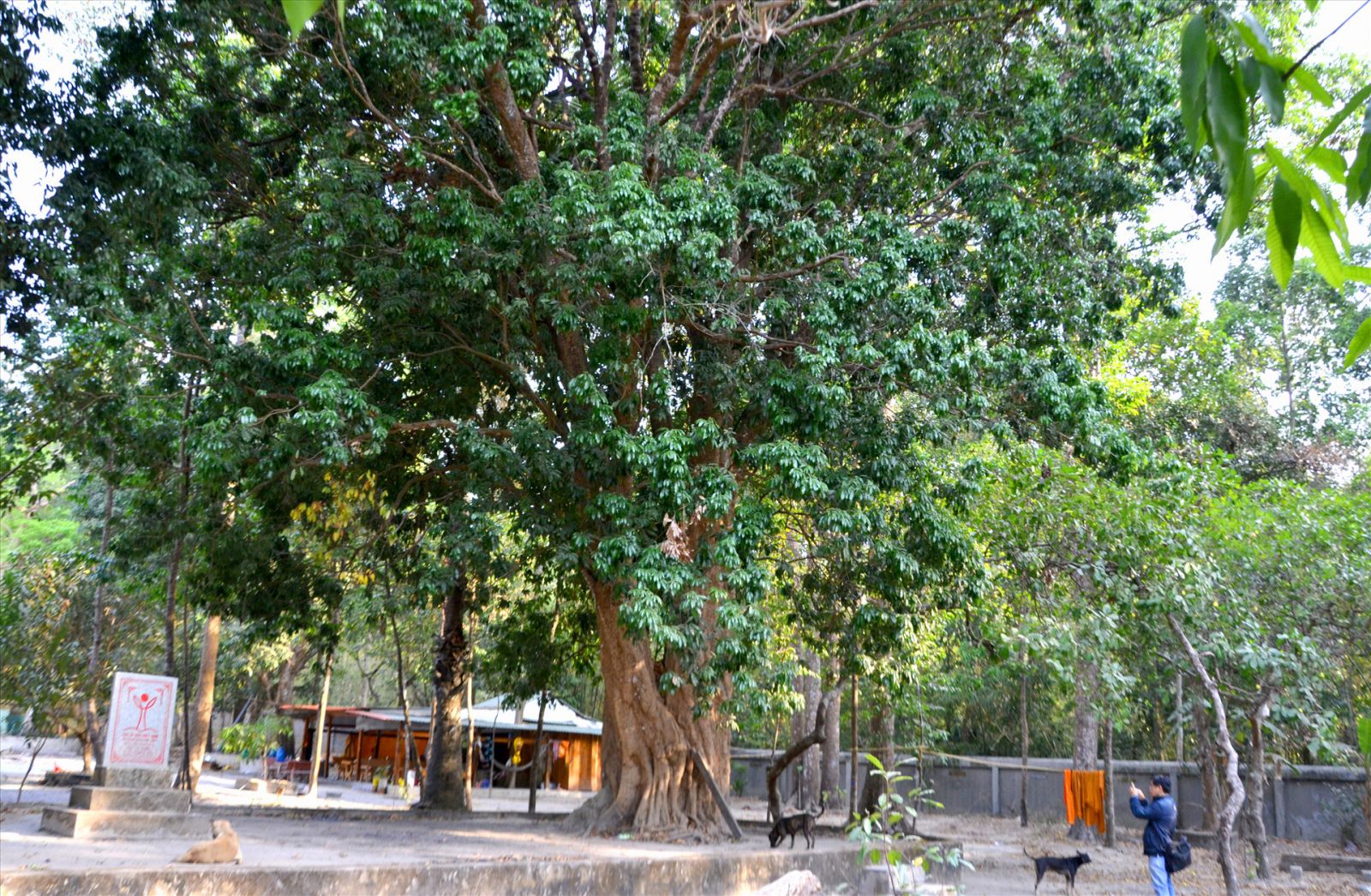 Mỗi cây có bề hoành to cỡ 4-5 người ôm, thân cao hơn 30m, tán trải rộng, tỏa bóng mát cả một góc sân chùa.