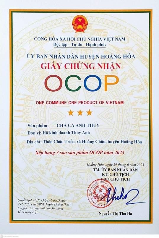 Chả cá Anh Thủy được công nhận sản phẩm OCOP Thanh Hóa 3 sào vào 31/7/2023.