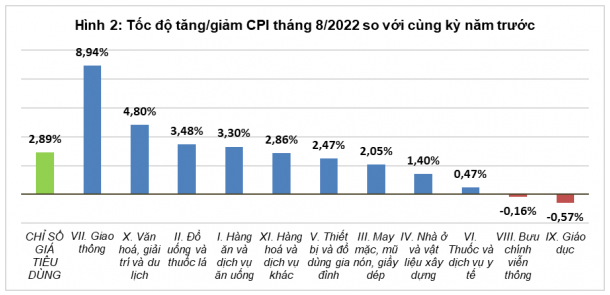 Theo Tổng cục Thống kê, mặc dù giá hàng hóa, dịch vụ tiêu dùng thiết yếu tăng theo giá nguyên liệu đầu vào và bước sang năm học mới 2022-2023, học phí giáo dục tại một số địa phương tăng trở lại, nhưng do giá xăng dầu trong nước liên tục được điều chỉnh giảm từ tháng 7/2022 đã làm cho chỉ số giá tiêu dùng tháng 8/2022 chỉ tăng nhẹ 0,005% so với tháng trước. So với cùng kỳ năm trước, chỉ số giá tiêu dùng tăng 2,89%.