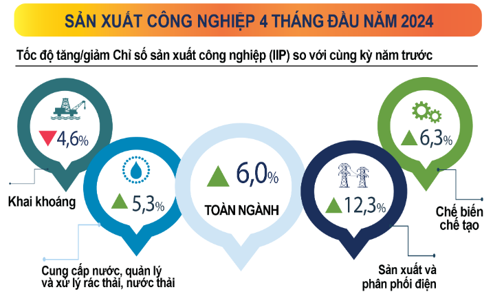 | Chỉ số sản xuất công nghiệp 4 tháng đầu năm 2024 tăng 6% so với cùng kỳ |