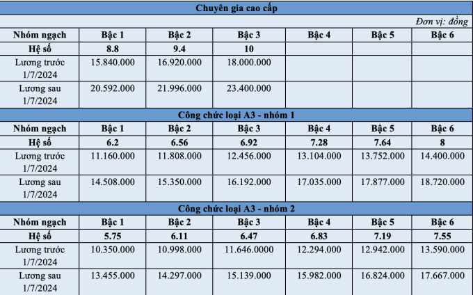 Chuyên gia cao cấp là nhóm nhận lương cao nhất, từ 20,5 đến 23,4 triệu đồng một tháng, tùy bậc. Mức này cao hơn hiện tại 4,7-5,4 triệu đồng.