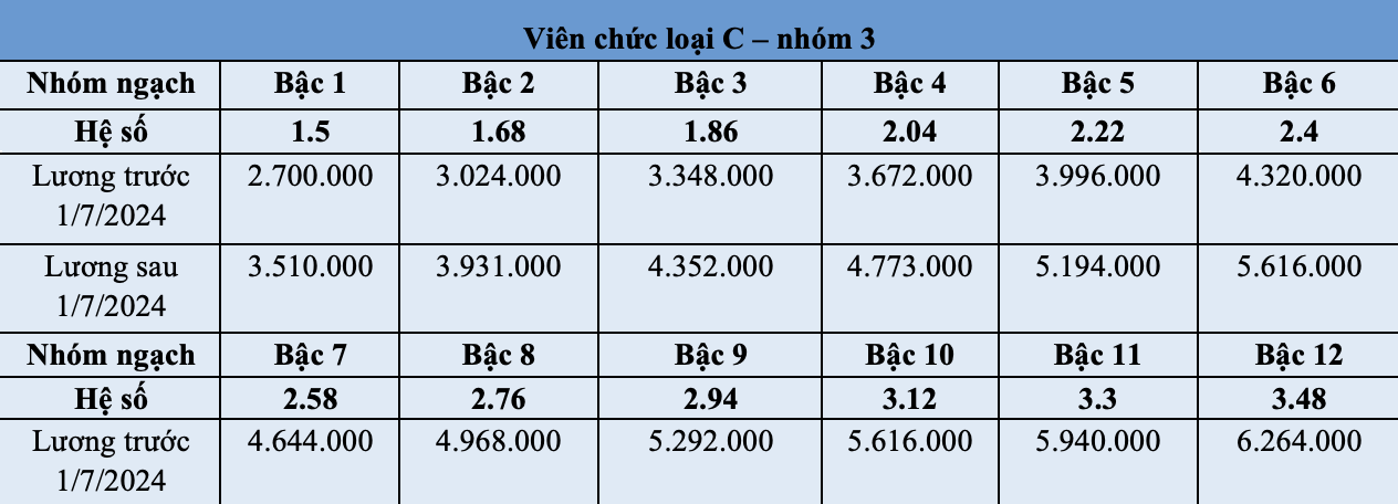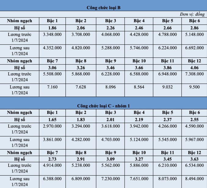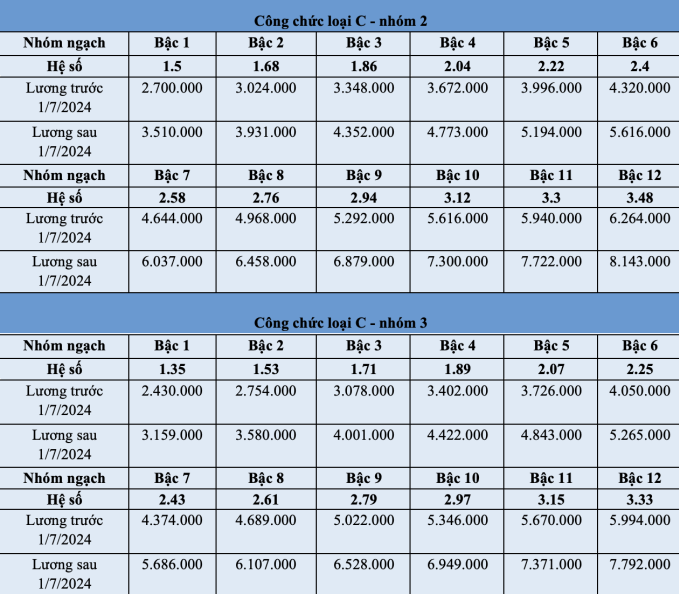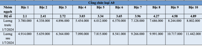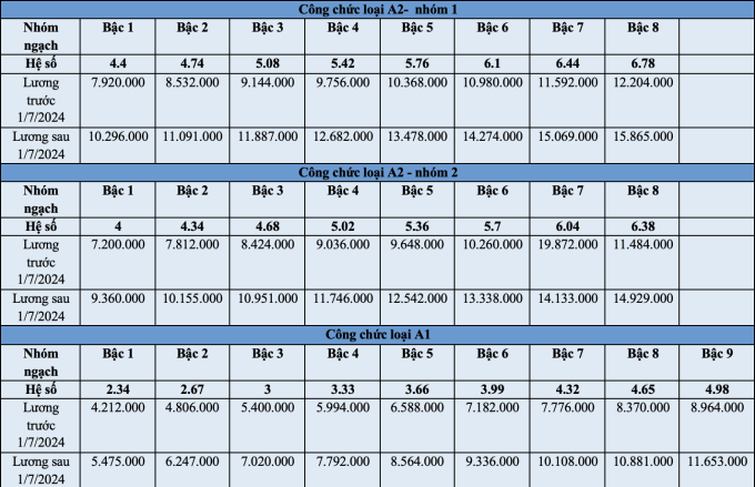 | Bảng lương công chức từ ngày 1/7/2024 theo mức lương cơ sở 2,34 triệu đồng/tháng. |