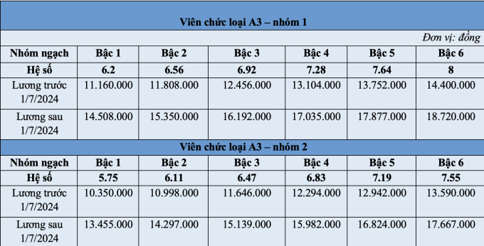 Nhóm viên chức, mức lương cao nhất là 18,7 triệu đồng một tháng; áp dụng với viên chức loại A3, bậc 6 như kiến trúc sư, kỹ sư, bác sĩ, phóng viên, biên tập viên cao cấp. Thấp nhất là 3,5 triệu đồng một tháng, áp dụng cho viên chức ngạch y công.