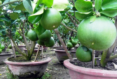 | Những cây bưởi da xanh trồng trong chậu được anh Hòa thử nghiệm xử lý trái thành công, chuẩn bị đưa ra thị trường cây kiểng chưng Tết |