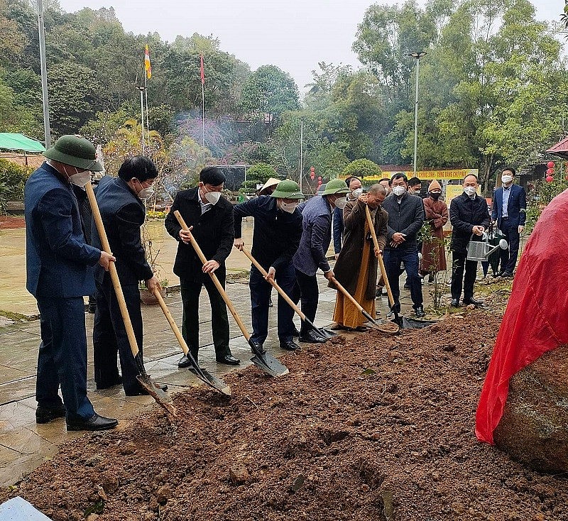 Tại di tích lịch sử chùa Am Vãi, trong không khí trang nghiêm, các đồng chí lãnh đạo tỉnh và huyện đã thành kính thắp nén tâm nhang và trồng cây lưu niệm tại khuôn viên chùa.