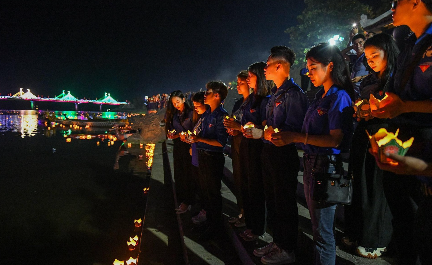 | Đoàn Thanh niên cầu nguyện, tri ân các anh hùng, liệt sĩ trước khi thả hoa đăng xuống sông. |