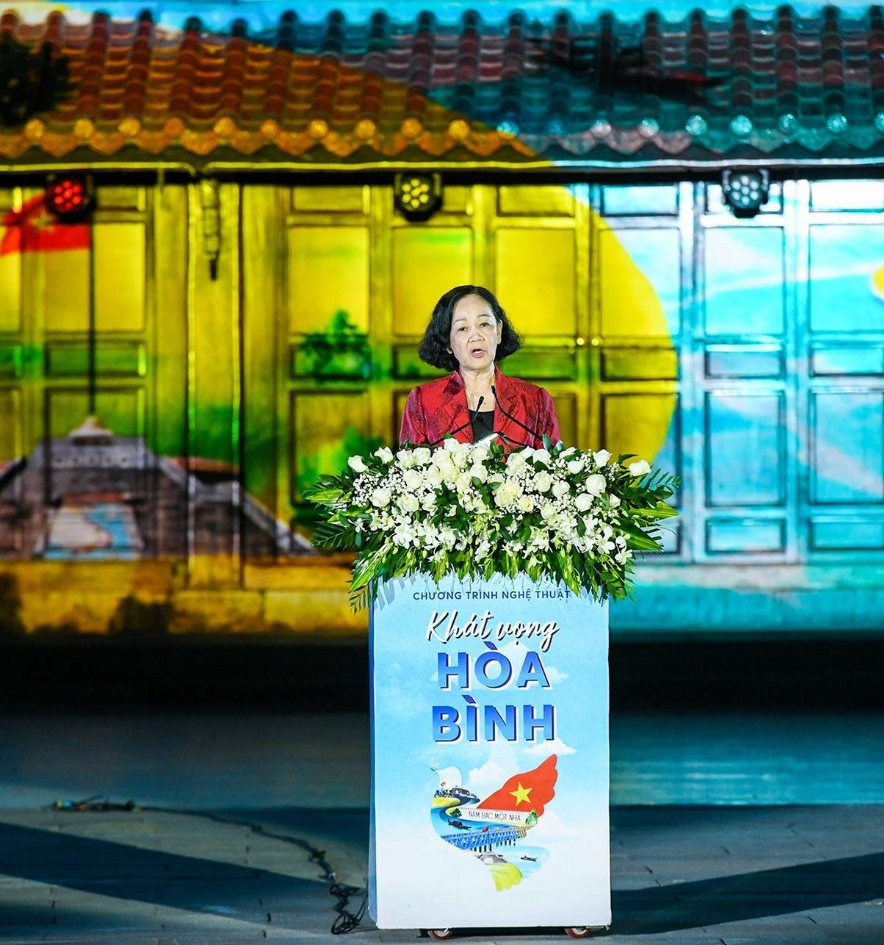 | Bà Trương Thị Mai - Ủy viên Bộ Chính trị, Trưởng ban Tổ chức T.Ư phát biểu tại Chương trình nghệ thuật |