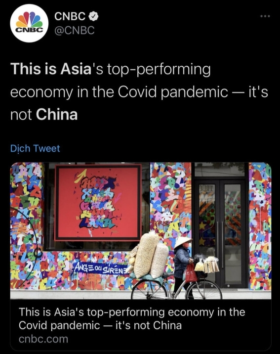 | Kênh truyền hình CNBC (Mỹ) chạy dòng title: "Đây là nền kinh tế hoạt động tốt nhất châu Á trong đại dịch Covid-19. Nền kinh tế này không phải là Trung Quốc" |