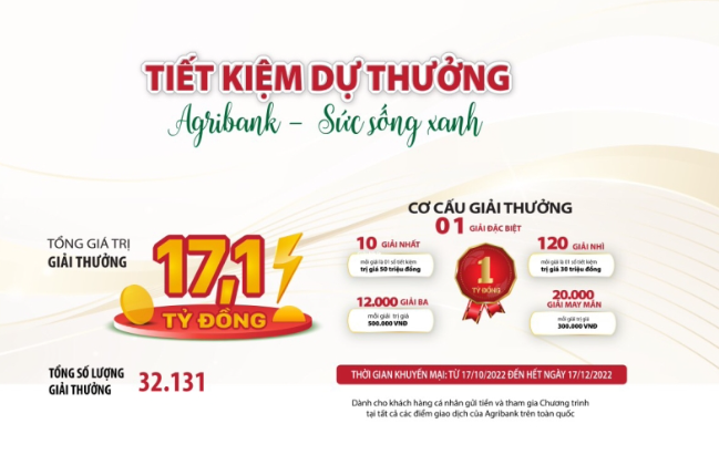 Nhằm đáp ứng nhu cầu về kênh đầu tư an toàn, sinh lời hiệu quả, đồng thời gia tăng lợi ích, tri ân Quý khách hàng gửi tiền, tiếp nối thành công hai chương trình tiết kiệm dự thưởng “Mùa hè Xanh – Tăng nhanh tích lũy” và “Cùng Agribank – Tăng nhanh Tài Lộc Agribank triển khai Chương trình tiết kiệm dự thưởng “Agribank – Sức sống Xanh” trên toàn quốc từ ngày 17/10/2022 đến hết ngày 17/12/2022 với tổng giá trị giải thưởng 17,1 tỷ đồng tương đương với hơn 32 nghìn giải thưởng.