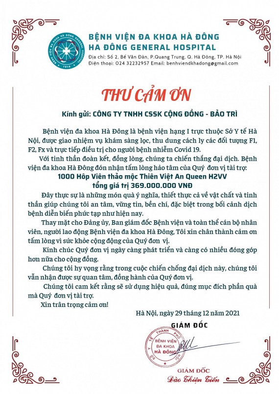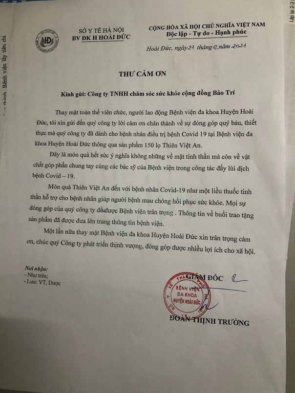 | Thư cảm ơn của nhiều Bệnh viện, Cơ sở thu tới Công ty Bảo Trí chung tay trong công tác phòng, chống dịch COVID-19 |