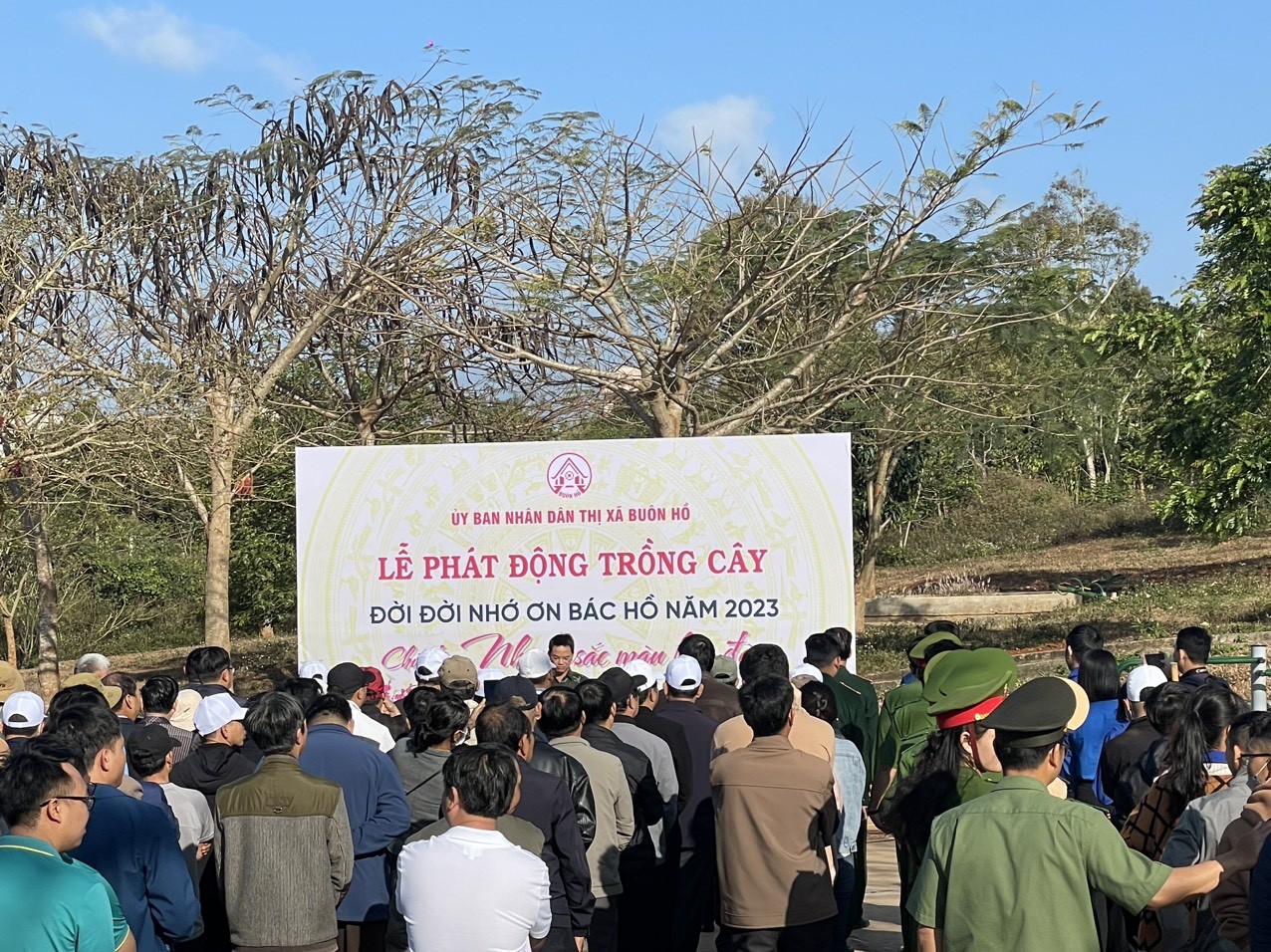 | Toàn cảnh lễ phát động trồng cây "Đời đời nhớ ơn Bác Hồ năm 2023" tại thị xã Buôn Hồ. |