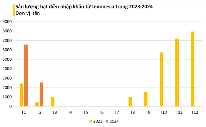 Cụ thể, tháng 2/2024, nhập khẩu hạt điều từ Indonesia đạt gần 2.555 tấn, tương đương 2,87 triệu USD, tăng 486% về lượng và tăng 452% về trị giá so với tháng 2/2023. Lũy kế 2 tháng, nhập khẩu loại nông sản này từ thị trường Indonesia đạt gần 9.122 tấn, trị giá gần 10,5 triệu USD, tăng 218% về lượng và tăng 205,3% về kim ngạch so với cùng kỳ năm ngoái.