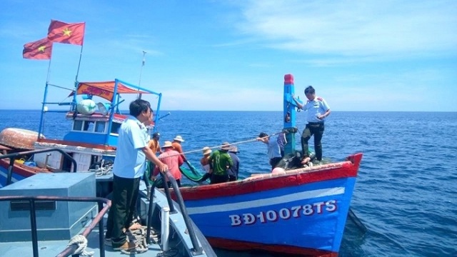 Ngành chức năng kiểm tra hoạt động đánh bắt thủy sản trên biển của ngư dân Bình Định. Ảnh: Vũ Đình Thung.
