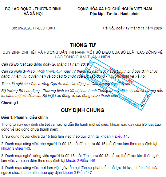 Danh mục công việc được sử dụng lao động chưa thành niên