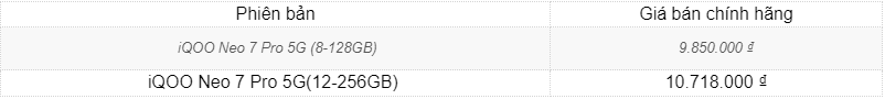 Bảng giá iQOO Neo 7 Pro chính hãng cập nhật mới nhất 2023